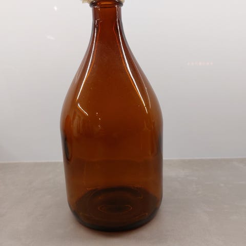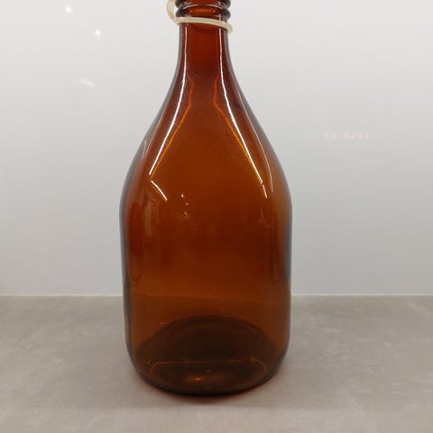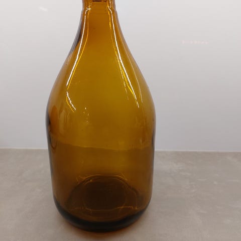 Vanha ruskea pullo. Posliini-metallinen korkki. Korkista ja pullon kaulasta pienet palat pois. Ks. kuva 3. Korkeus n. 29 cm