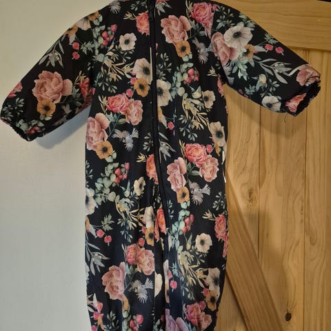 Ihana NameItin kukkakuosinen toppahaalari, kahdella lapsella käytetty ns kauppahaalarina. Kuvissa näkyy polvien pientä karheumaa. Hupun irrotettava karvareunus hukkunut.