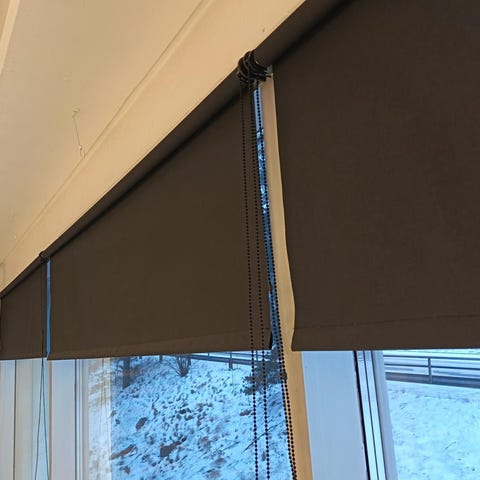 Verhoomosta mittatilauksena tehty pitkä pimennysrullaverho.