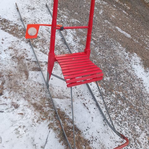 Punainen pieni lastenkokoa oleva potkukelkka vaikka järvenjäälle.