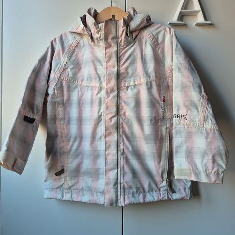 Valmistajan koko 90, mutta käytetty jo koossa 86 kääntäen hihansuita ja käytetty kokoon 98 asti purkaen hihojen ja lahkeiden vuorikankaassa olevat laajennusvarat (Didriksons-ominaisuus). Nämä on nyt siis kokoa n. 98, mutta saa takaisin pienempään kokoon parsimalla laajennusvaran takaisin paksulla langalla (esim kalastajalanka). Tämä asu menee siis pitkän aikaa laajennusvaran kanssa.