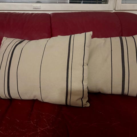 Beiget nätit sohvatyynyt. Samettia taitaa olla. Vetoketjusuljenta.
