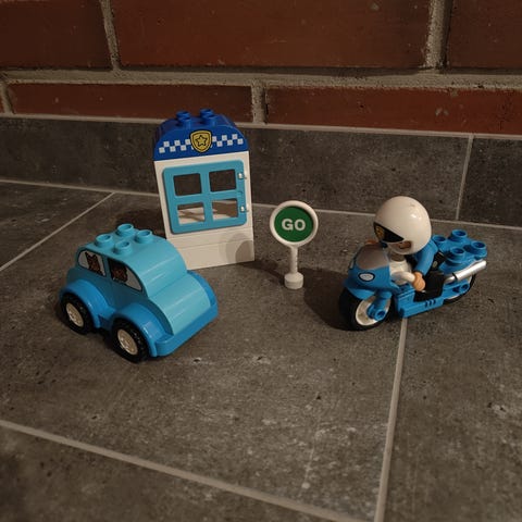 LEGO DUPLO Poliisi ja moottoripyörä sisältää poliisimoottoripyörän, poliisihahmon ja poliisiaseman osia. Sopii 2-vuotiaille ja sitä vanhemmille lapsille.