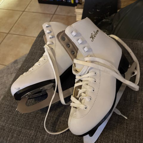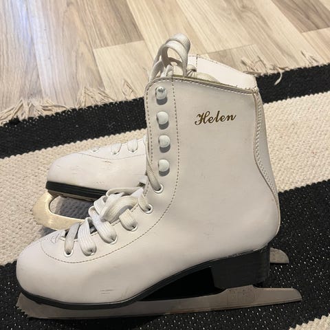Helen luistimet koko 38, väri valkoinen. Hyvä kuntoiset, pientä tummaa jälkeä säilytyksestä. Pieni 38. Pohjallisen pituus 24,5cm.