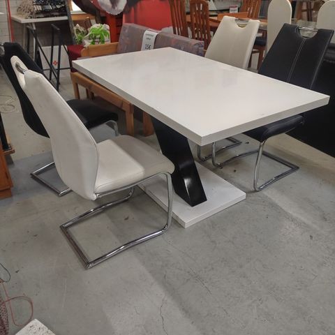 Ruskea kansi ja valkoiset jalat. Koko 140x85 ja jatkopala 40. Kannessa muutamia jälkiä. Valkoiset tuolit, 4 kpl.
