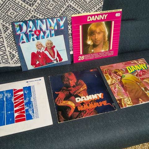Myynnissä Dannyn vinyyli Lp-levyt, 6 kpl. Levyt soivat pääosin hyvin. Eka ja Mentävä on levyt tyydyttävästi eli jonkin verran napsuja ja ritinöitä on. Kansissa on jonkin verran käytön jälkiä, ring wearia, taittumia. Ekan levyn selkämys auki 10 sentin matkalta ja teippauksia on: Mentävä on, In Beat ja Parhaita levyissä.
