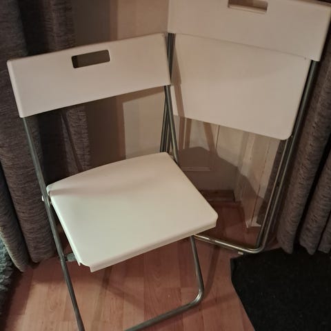 H&M Homen klaffituoli. Kunto on muutoin siisti, mutta molemmille sivuille on tullut kulumaa pöydästä. Maalilla saisi mahdollisesti paremmaksi 🙂