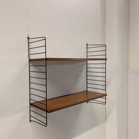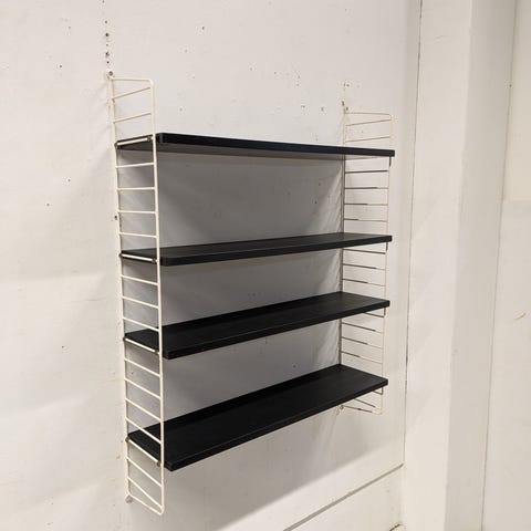 Tämä upea 50/60-luvun String tyylinen seinähylly etsii uutta kotia. Päädyt hiljattain entisöity mustaksi. Hyllyt eivät ole alkuperäiset, mutta erittäin hyvässä kunnossa. Pääty hyllyä syvempi. Hyllyt voi näin ollen asentaa keskellä tai halutessaan seinään kiinni.