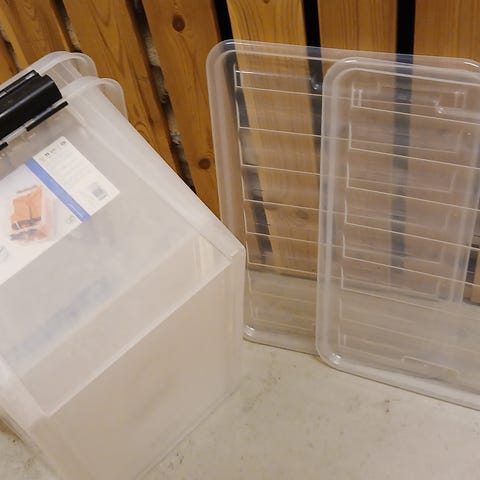 2 kpl extra vahvoja 80 litran laatikoita (pituus 60 cm, leveys 41 cm, korkeus 39 cm). https://www.biltema.fi/koti/sailyttaminen/muuttolaatikot/muuttolaatikko-ekstra-vahva-80-litraa-2000061630