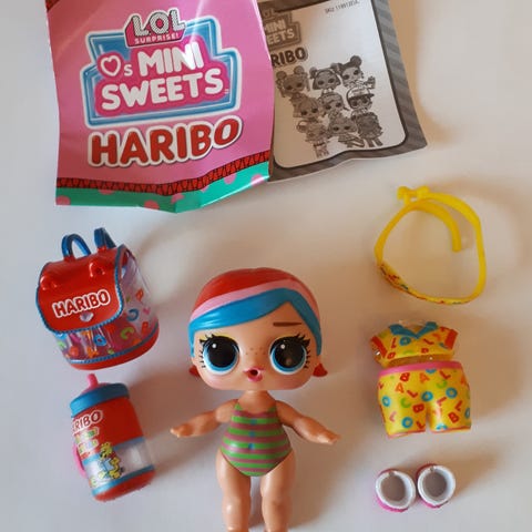 Kuvan mukaiset Lol surprise haribo aiheiset nuket ja tarvikkeet.