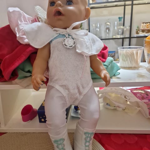 Baby Born nukken vaatteet ja tarvikkeet sisältävät mustavalkoisen ruutukuvioisen paidan, punaisen kukkakuvioisen mekon, vaaleanpunaiset kuviolliset housut, vaaleanpunaisen kuviollisen ruokalapun ja ruskeat saappaat.