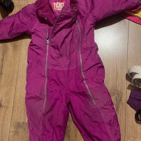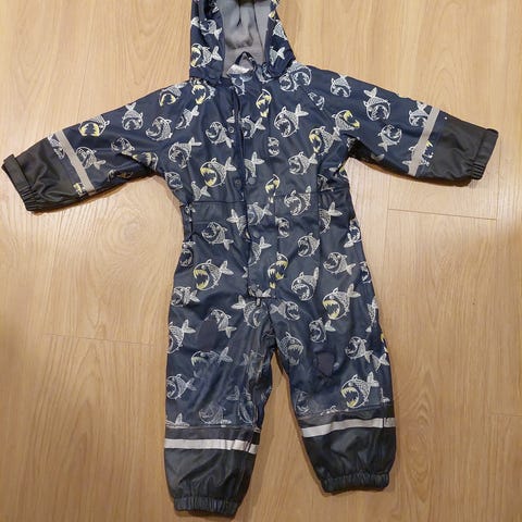 Hyväkuntoinen ohut sadeasu koossa 80. Takki punainen, housut tummansiniset.