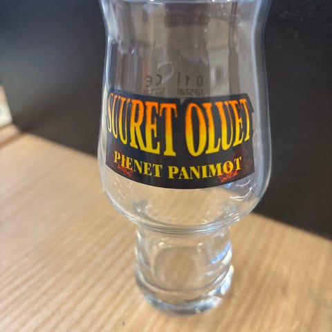 Suuret oluet pienet panimot tapahtuman juomalasi. Takana kuva ja teksti ”Suomi 100 lasissa”. 0.2, 0.33 ja 0.4L mittaviivat.