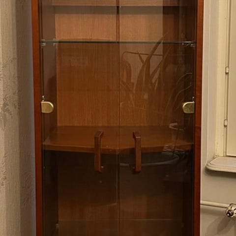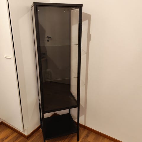 Myydään musta vitriinikaappi lasiovella.