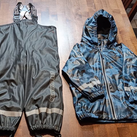 Hyväkuntoinen vuorellinen sadeasu koossa 86/92.