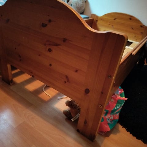 Käytetyssä kunnossa oleva lasten sänky. Sänkyyn ei ole tallessa toista korkeaa reunaa.