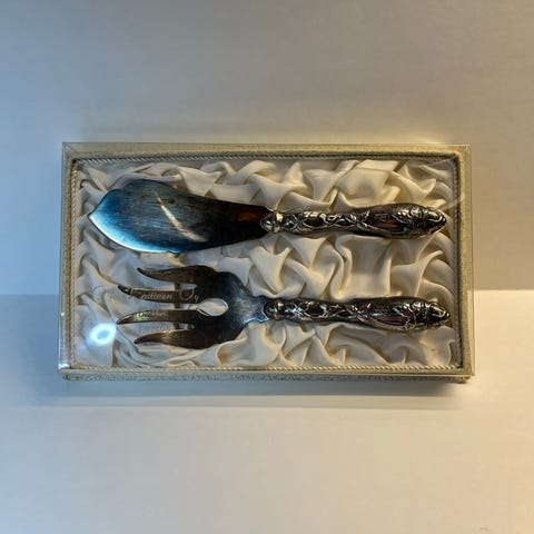 Valmistusvuosi 1999, 830 hopeaa, lusikan pesä myös hopeaa ja kullattu. Ei ole koskaan käytetty. Patinoituneet.