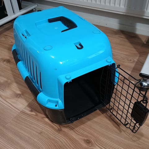 Matkakoppa lemmikille, valmistettu valkoisesta ja vaaleanpunaisesta muovista. Kopassa on läpinäkyvä etuovi ja useita ilmanvaihtoaukkoja sivuilla ja ylhäällä. Sopii pienen lemmikin kuljetukseen.