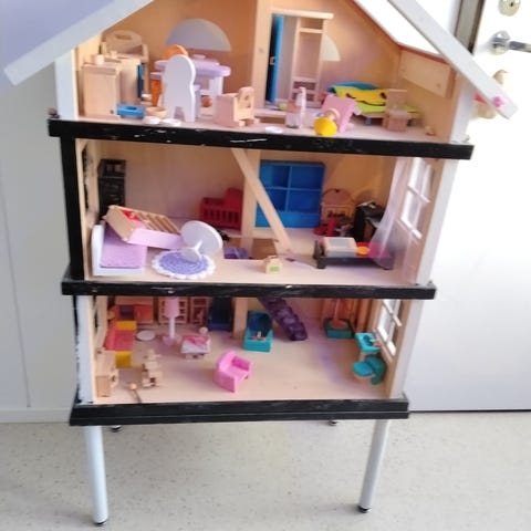Hyväkuntoinen isokokoinen nukkekoti, johon saa halutessaan ruuvattua puiset jalat.