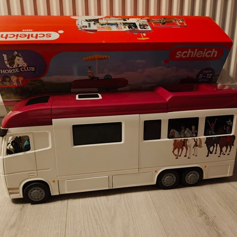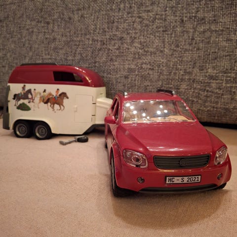 Valot ja äänet toimivat. Kaikki ovet aukeavat ja pyörät pyörivät. Schleich-hepat eivät mahdu sisälle, varsat kyllä.
