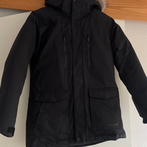 Hyväkuntoinen musta toppatakki. Takin sivuissa nepparit helmassa, jotka voi avata, niin leikit ja istumiset sujuu paremmin.