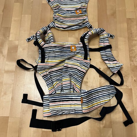 Keskellä verkkokangasta, joka etenkin helteillä on mukava kannettavalle. Pääntukea saa säädettyä lapsen kasvun mukana. Edessä pikkutasku esim avaimille.