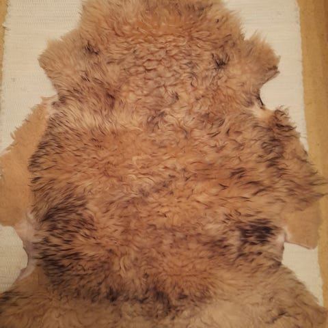 Pitkä, aito, pisimmillään n. 120cm luonnonvalkoinen lampaantalja. Leveys 45-70cm. Käytetty lastenrattaissa. Käytön jälkiä on! Olen puhdistanut ainoastaan tuulettamalla, soodalla kuivapesuna ja imuroimalla. Läikkiä nahassa, tummentumaa villassa ja lisäksi "takkuinen".