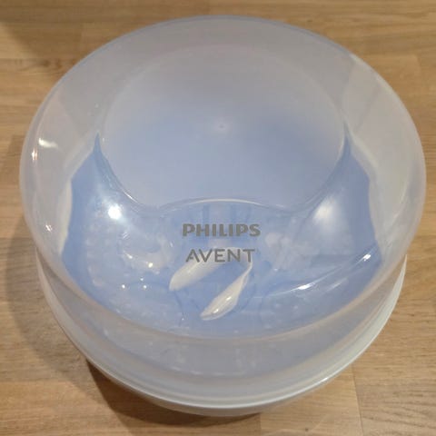 Philips Avent mikrosterilointilaite, jolla tuttipullojen, tuttien ja rintapumpun osien sterilointi käy nopeasti ja vaivattomasti.