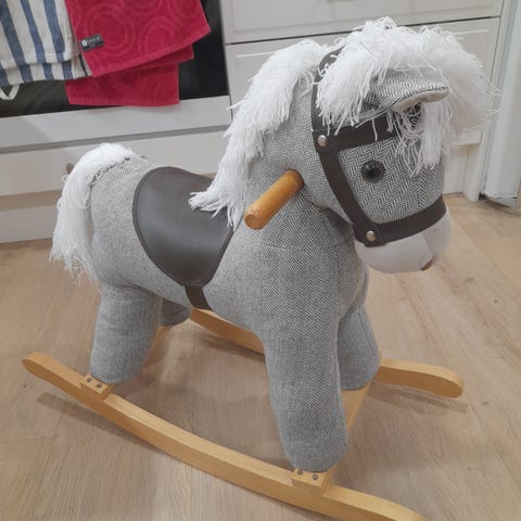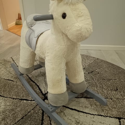 Kaunis keinuhevonen, vaaleanruskea /kellertävä väri, pehmeä materiaali. Sopii lasten leikkeihin ja sisustukseen. Heppa on aikoinaan hirnunut, mutta äänitoiminto ei enää toimi.