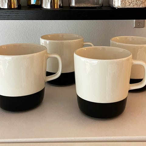 Kaksi Marimekon 4dl kokoista mukia. Muuten erittäin hyvässä kunnossa, pl. toisen mukin pohjan tekstin pieni kuluma.