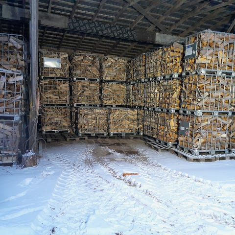 Polttopuut varastoituna metallitelineissä ulkona. Telineet ovat pinottuja ja sisältävät halkoja, jotka ovat valmiita käytettäväksi. Huom metalli häkit eivät kuulu ostokseen. kaksi vuotta kuivuneet tuossa joten hyvin kuivia.