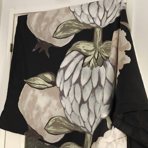 Myydään kaksi Vallilan pussilakanasettiä. Valkoinen taustaväri, kuvioissa mustaa ja ruskeaa. Alalaidassa on ollut napit, jotka kuitenkin mankelissa rikkoutuneet.
