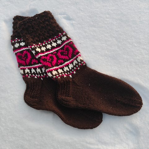 Kauniit pitkävartiset käsin neulotut kirjoneule sukat, koko 38/39. Nouto lahdesta / postitus kuluja vastaan.