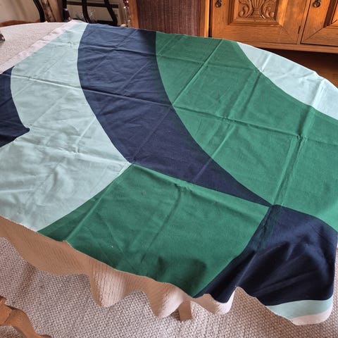 Marimekko Savanni -kangas.on valmistettu kankaasta, jossa vihreän, sinisen ja valkoisen sävyjä. Malli on suunniteltu Maija Isolalle vuonna 1987 ja valmistettu vuonna 2003. Sopii pöydän kattamiseen ja sisustukseen.