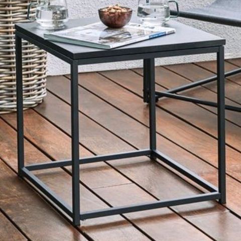 Musta ulkopöytä, kulmista pyöristetty muotoilu. Pöytä on valmistettu kestävästä materiaalista ja soveltuu ulkokäyttöön. Pöytä on kevyt siirrellä. Pinnassa on käytön jälkiä ja ollut käytössä paljon.