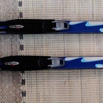Kahdet luistelusukset Karhu ja Salamon merkiset SNS siteillä sekä yhdet sauvat 145 cm