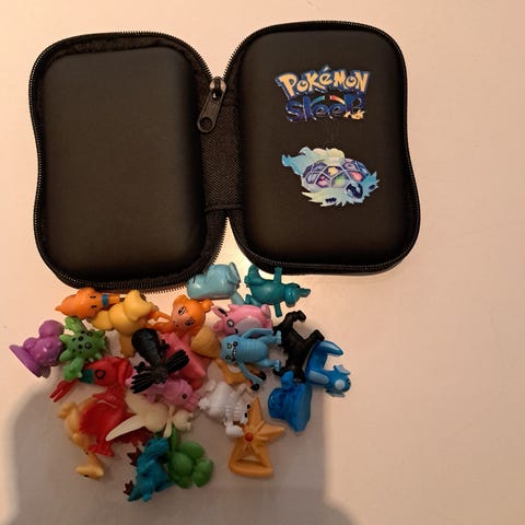 Pokémon lastenlelut, useita pieniä hahmoja eri väreissä ja muodoissa. Lelut ovat muovia ja sopivat lasten leikkeihin.