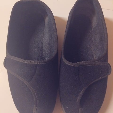 Mustat tarrasäädettävät tohvelityyliset erikoisjalkineet.