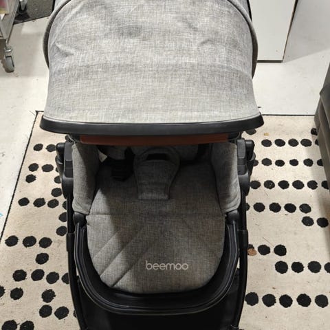 Beemoo lastenvaunut harmaalla kankaalla. Vaunut sisältävät kantokopan ja istuinosan, jotka on kiinnitetty alumiinirunkoon. Etupyörissä joustojärjestelmä. Pyörät ovat kovat ja kestävät. Sopivat pienten lasten kuljettamiseen.