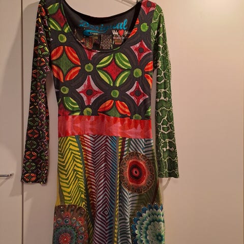 Myydään Desigual trikoomekko (puuvillaa). Koko-/pesuohjelappu leikattu pois, mutta koko on noin S/M. Leveys kainalosta kainaloon n. 44 cm, kapeimmasta kohdasta n. 36 cm, pituus n. 91 cm, hiha n. 60 cm. Vain muutaman kerran käytetty.