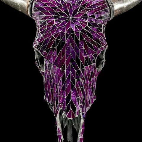 Lehmäkallo, joka on peitetty lasilla. Kallo on kokonaan käsin koristeltu suurella huolella. Se on epätavallinen, koristeellinen kappale.