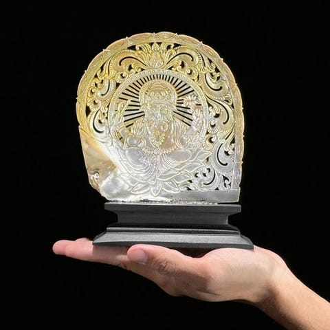 Täysin kaiverrettu suuri äidinhelmiä sisältävä simpukka, erittäin yksityiskohtainen. Simpukan kaiverrus on tehty mustekalasta. Simpukka on kaiverrettu balilaisen artesaanin toimesta, joka on mestari kaiverrustaidossa. Hän on yksi harvoista, jotka pystyvät kaivertamaan näin korkealla tasolla. Hän on todellakin yksi alan parhaista ja tunnetuimmista. Simpukka tulee puisen jalustan kanssa.