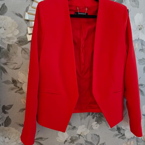 MNG-merkkinen kirkkaanpunainen jakku. Sopii värianalyysissä kevään saaneelle, eli suurimmalle osalle suomalaisista. Koko M, erinomainen kunto. Myyn, koska ei sovi omaan tyyliin kuitenkaan. Ei lemmikkejä, tupakointia, tuholaisia tms.