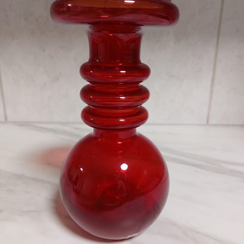Tamara Aladin punainen Carmen kääntömaljakko, ehjä ja siisti. Kaunis punainen koriste-esine, menee maljkkona ja kynttilänjalkana käännettynä. Riihimäen lasi.