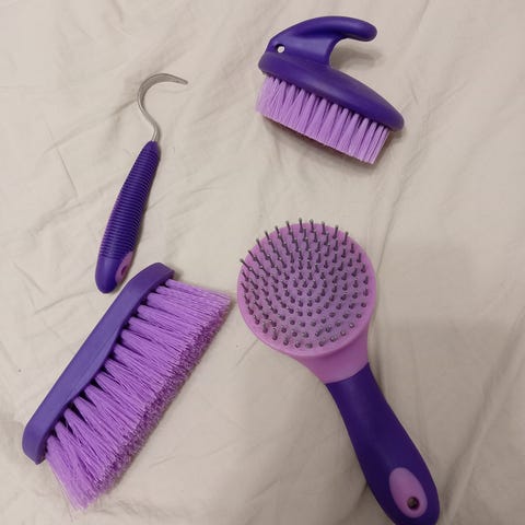Pinkki showmaster harjakassi täynnä harjoja. Vähän, käytetty kassi ja harjoja. Myös muutama käyttämätön harja. Käyttöön oikealle ponille tai hevoselle tai sitten vaikka puuhevoselle leikkeihin🩷
