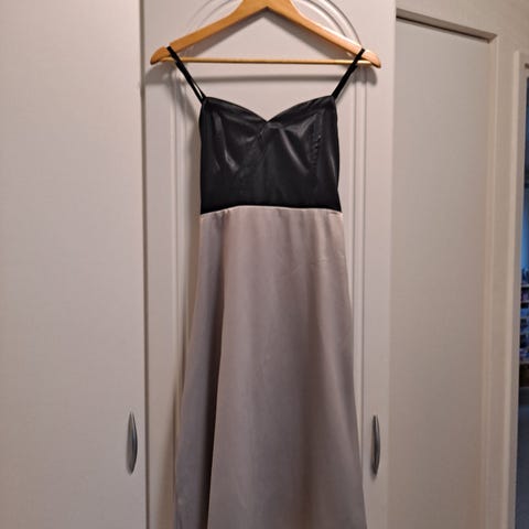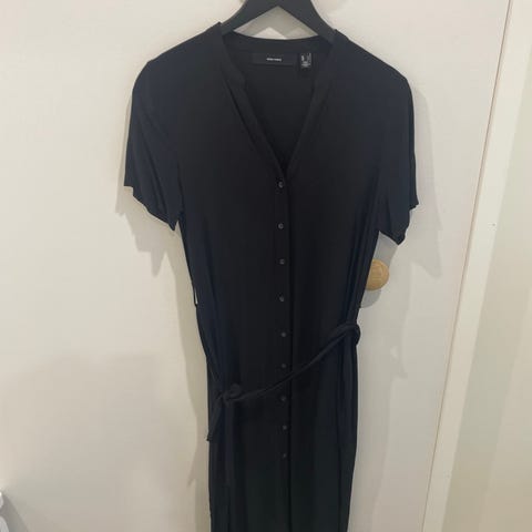 VeroModa musta ohut mekko valkoisilla pilkkukuvioilla koossa L. Kaula-aukon reunassa pitkät tupsulliset solmiamisnauhat, vyötäröllä leveä kuminauhakiristys. Vuorattu mustalla, paitsi hihat. Uudenveroinen. Kainalo-kainalo 55 cm, olka-helma 102 cm.