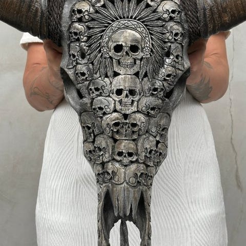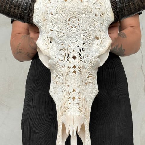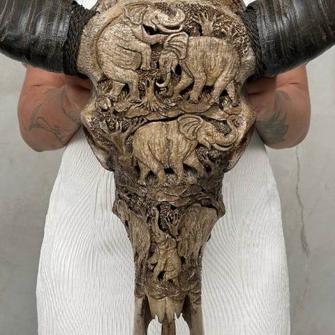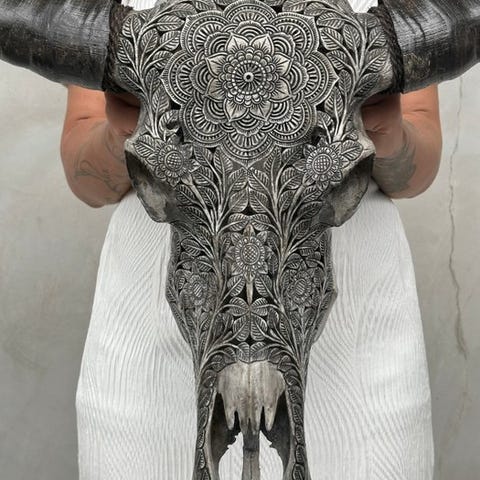 Suuri vesipuhveli-kallo, joka on kaiverrettu käsin lahjakkaiden balilaismestareiden toimesta. Heidän isänsä ovat siirtäneet ikivanhan kaiverrustaidon pojilleen. Tämä kallo on täysin avattu kaiverruksella. Kaiverrus on poikkeuksellisen korkealaatuista.