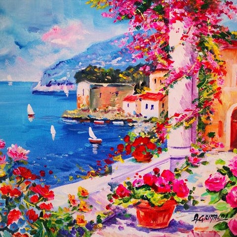 Upea ja vaikuttava öljy taululla, mitat 30 x 40, mestarilta Giuseppe Luongo Partenopeo (1948). Kuvassa on näyttävä kulma, jossa on Capriin kalastajien veneet, ja värit ovat erittäin kauniit, mikä kertoo erinomaisesta maalaustaidosta. Vähäiset ikääntymisen merkit ovat taululle merkityksettömiä. Alareunassa on taiteilijan allekirjoitus ja takana taiteilijan signeerauksella varustettu todistus. Peräisin yksityiskokoelmasta, ja lähetys on seurattavissa.