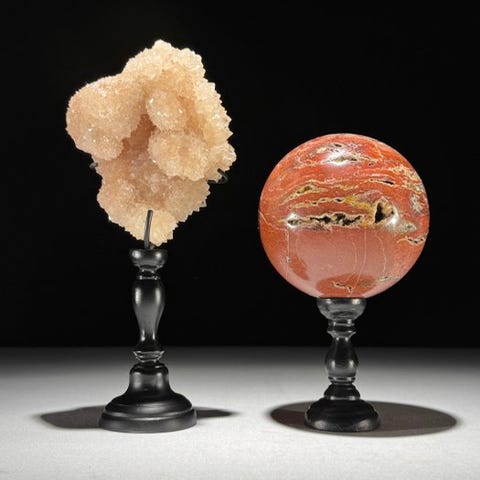 Upea kalkkiittikristallikimpale ja kvartsikristallipallo räätälöidyillä jalustoilla.