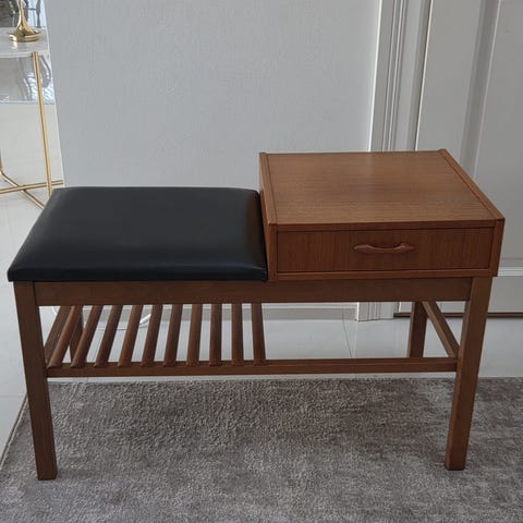 Koivuinen selkeälinjainen puhelinpöytä pehmustetulla penkkiosalla ja laatikolla.